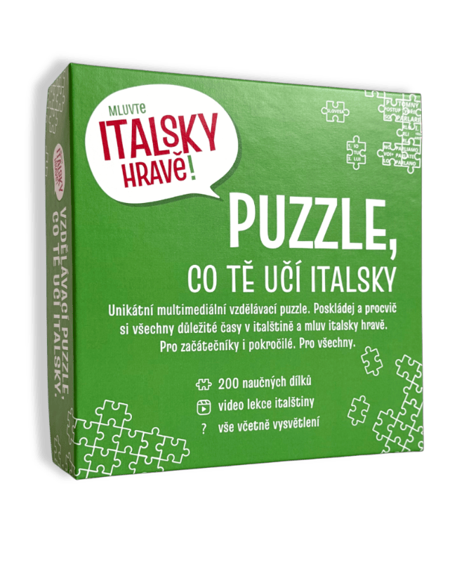 Unikátní italské multimediální puzzle, co tě učí italský jazyk. Tady ovšem nemáte žádnou předlohu, podle které si máte dané puzzle složit, tady se všechno dozvídáte postupně skládáním tohoto jedinečného puzzle. Nejdříve si složíme časovou osu v italštině. Zaměříme se na všechny důležité italské časy. Na časové ose se pak objeví odkazy na webové stránky, kde najdete pro Vás vyrobené video lekce s danou gramatikou a další návody, jak si složit další část tohoto puzzle. Vy se tak postupně učíte, skládáte a objevujete. Dokonalé.